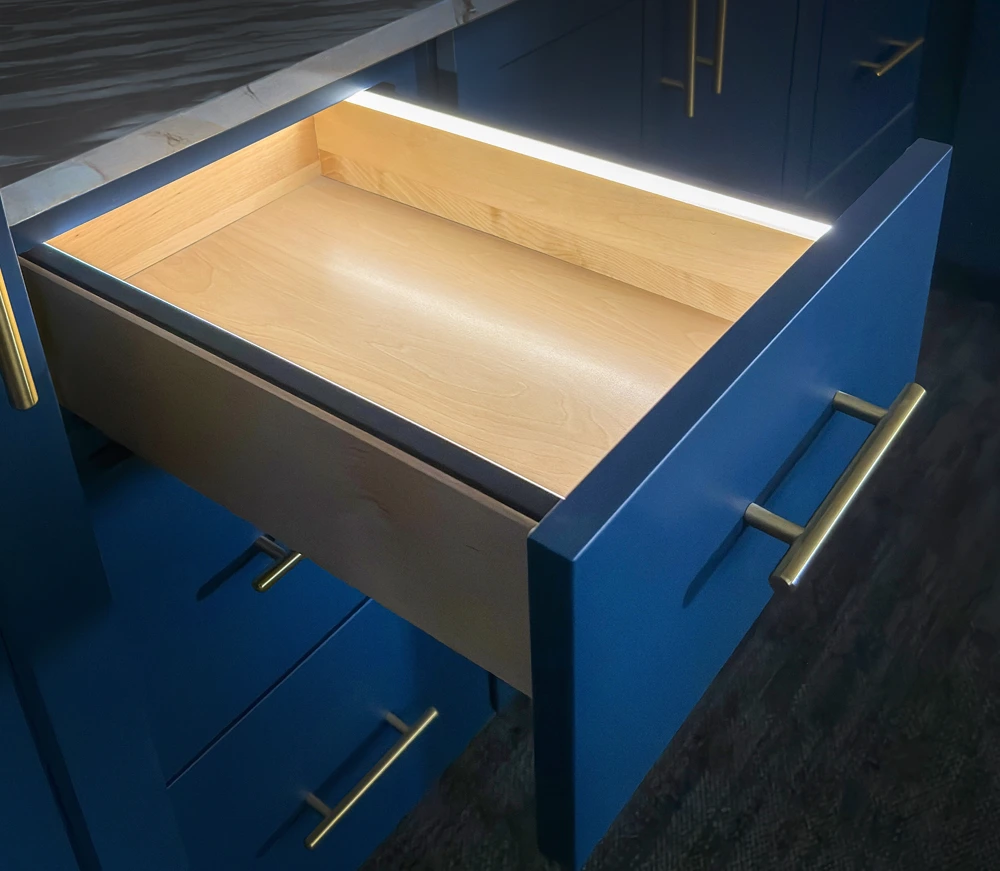 An European style cabinet construction type, or a box without a frame on the front of the cabinet. An additional feature of the base cabinet is the 4″ wide runners on the top and bottom of the drawer opening for maximum strength and stability. The drawers are made of pre-finished 5/8″ thick solid wood material with Tandem Blumotion guides, a zinc-coated, full extension undermount guide that is smooth and silent and soft-closes when the drawer is two inches from the box.